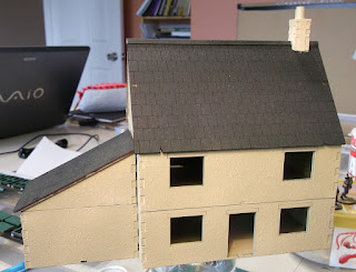 The kit includes a length of plastic pipe that you can cut to make a chimney pot but I've found that cyclindrical lego 'bricks' give a good result for much less effort. Also included is a length of plastic strip to act as ridge tiles for the roof. I've glued on the chimney and trimmed the plastic to fit either side.